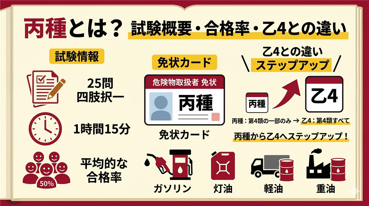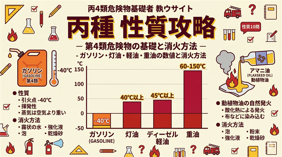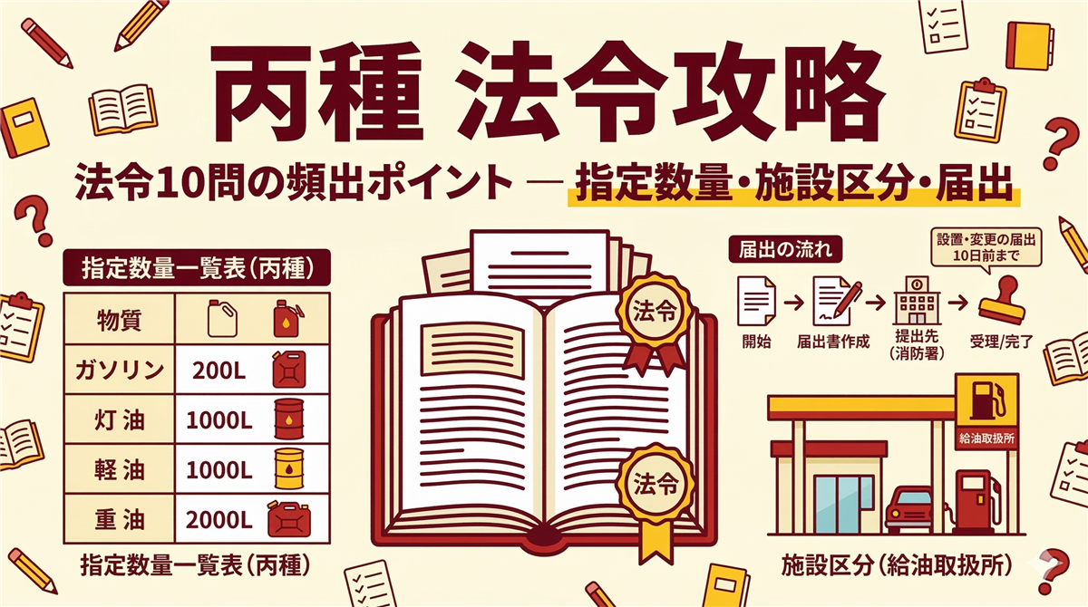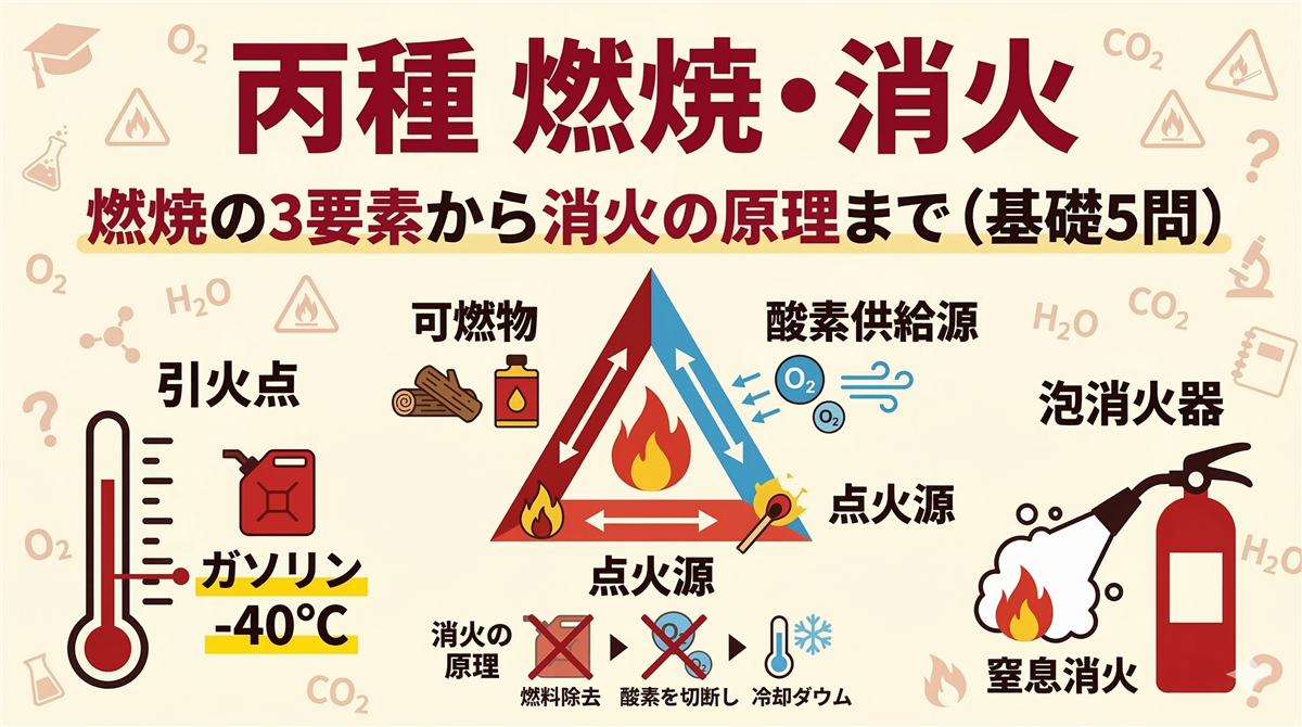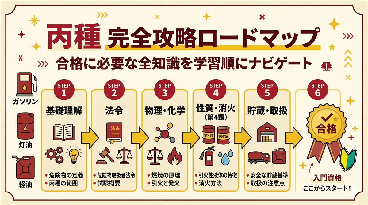 このページの使い方 このページは丙種危険物取扱者に合格するための学習ロードマップです。丙種は危険物取扱者の中で最もやさしい入門資格。ガソリン・灯油・軽油・重油など、身近な燃料を取り扱えるようになります。 全25問・四肢択一(乙種は五肢択一なので、丙種のほうが選びやすい!)。上から順に読み進めていけば合格に必要な知識が身につきます。 試験構成法令10問合格ライン:6問以上(60%)燃焼・消火5問合格ライン:3問以上(60%)性質・消火10問合格ライン:6問以上(60%) 試験時間:1時間15分 / 四肢択一 ...