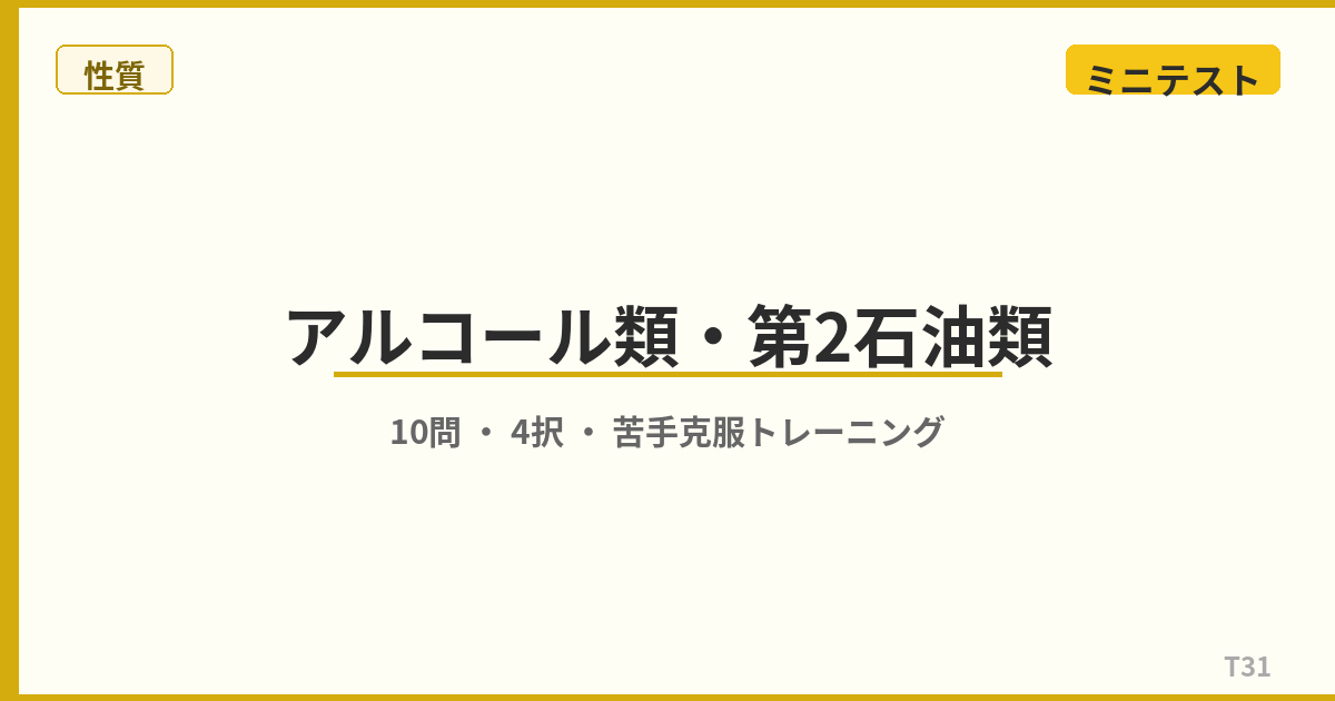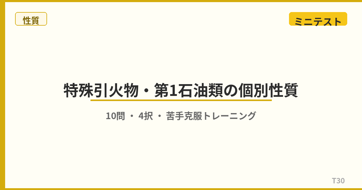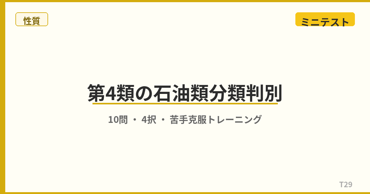 第3石油類・第4石油類・動植物油類は「引火点が高い=安全」ではありません。重油の種類、ヨウ素価と自然発火の関係など、見落としがちなポイントを10問でチェック! ミニテスト 10問 問1 第3石油類の引火点の範囲として、正しいものはどれですか。 (1)21℃以上70℃未満(2)70℃以上200℃未満(3)200℃以上250℃未満(4)250℃以上 解答を見る 正解:(2) 第3石油類は引火点70℃以上200℃未満です。代表的な物質は重油・クレオソート油・グリセリンなど。指定数量は非水溶性2,000L、水溶性 ...