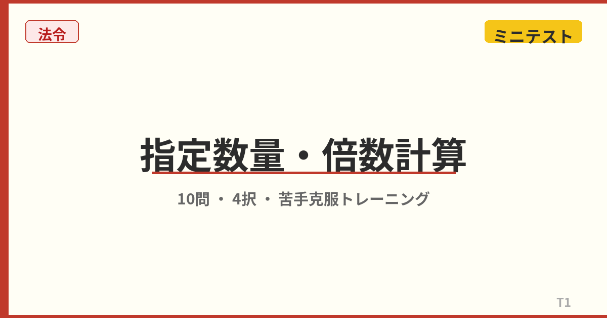 指定数量と倍数計算、得意ですか? 危険物取扱者試験では、指定数量と倍数計算が繰り返し出題されます。特に第4類の指定数量は、品名ごとに細かく数値が決まっているため、暗記が甘いと本番で失点しやすいポイントです。 このミニテストでは、指定数量の暗記確認から倍数の計算問題、さらに関連する法令知識まで10問にまとめました。1問ずつ解答・解説を確認しながら進めてみてください。 問1 ガソリン(非水溶性)の指定数量として正しいものはどれか。 (1)50L(2)200L(3)400L(4)1,000L 解答を見る 正解: ...