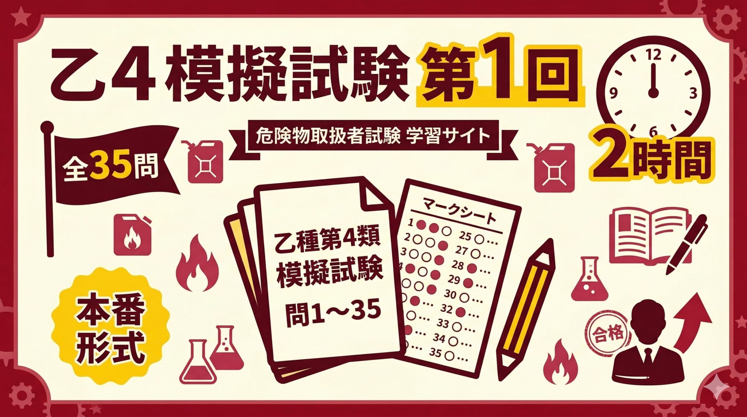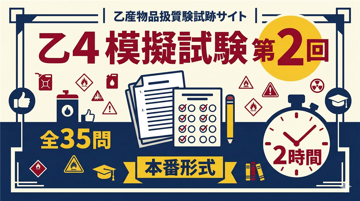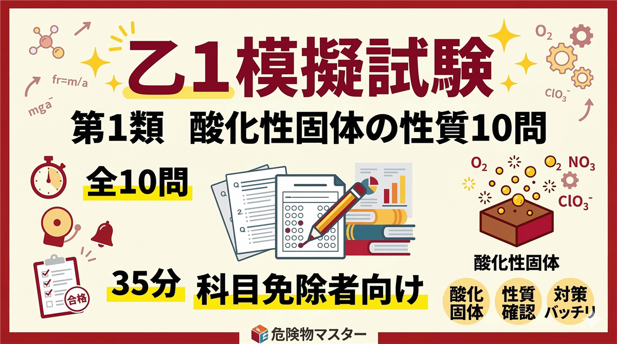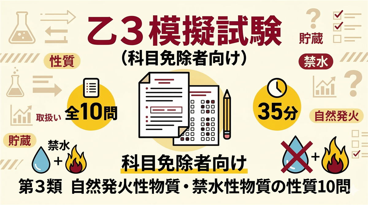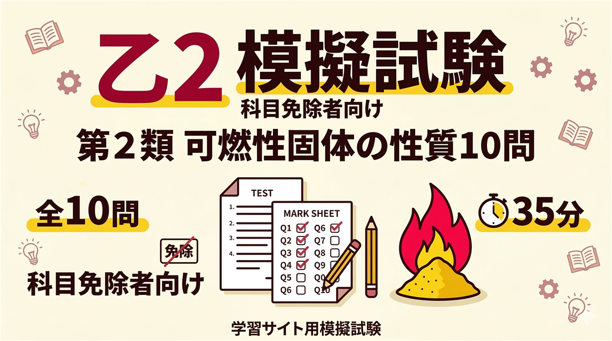 乙3(第3類・自然発火性物質/禁水性物質)模擬試験とは? この模擬試験は、乙種第4類などの免状をお持ちの科目免除者が乙種第3類を受験するための実力チェックテストです。 科目免除により「危険物の性質並びにその火災予防及び消火の方法」の10問のみで合否が決まります。試験時間は35分です。 科目問数合格ライン 危険物の性質並びにその火災予防及び消火の方法10問6問以上正解(60%) 使い方 ① 解答用紙を印刷またはメモを用意する② 35分を計って全10問を解く③ 解答・解説ページで答え合わせをする💡 事前復習に ...
