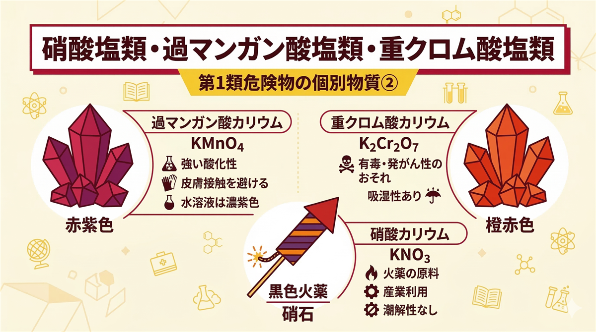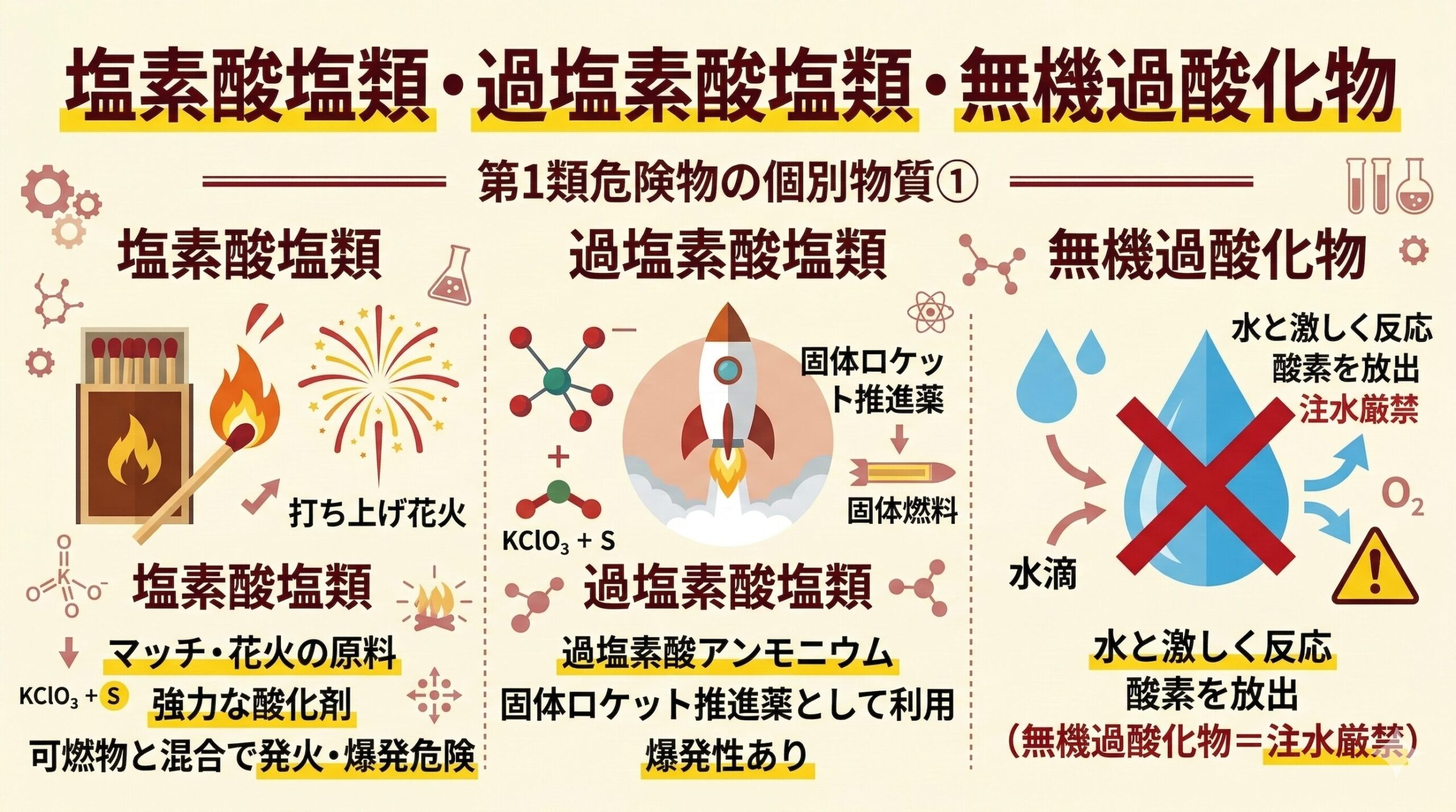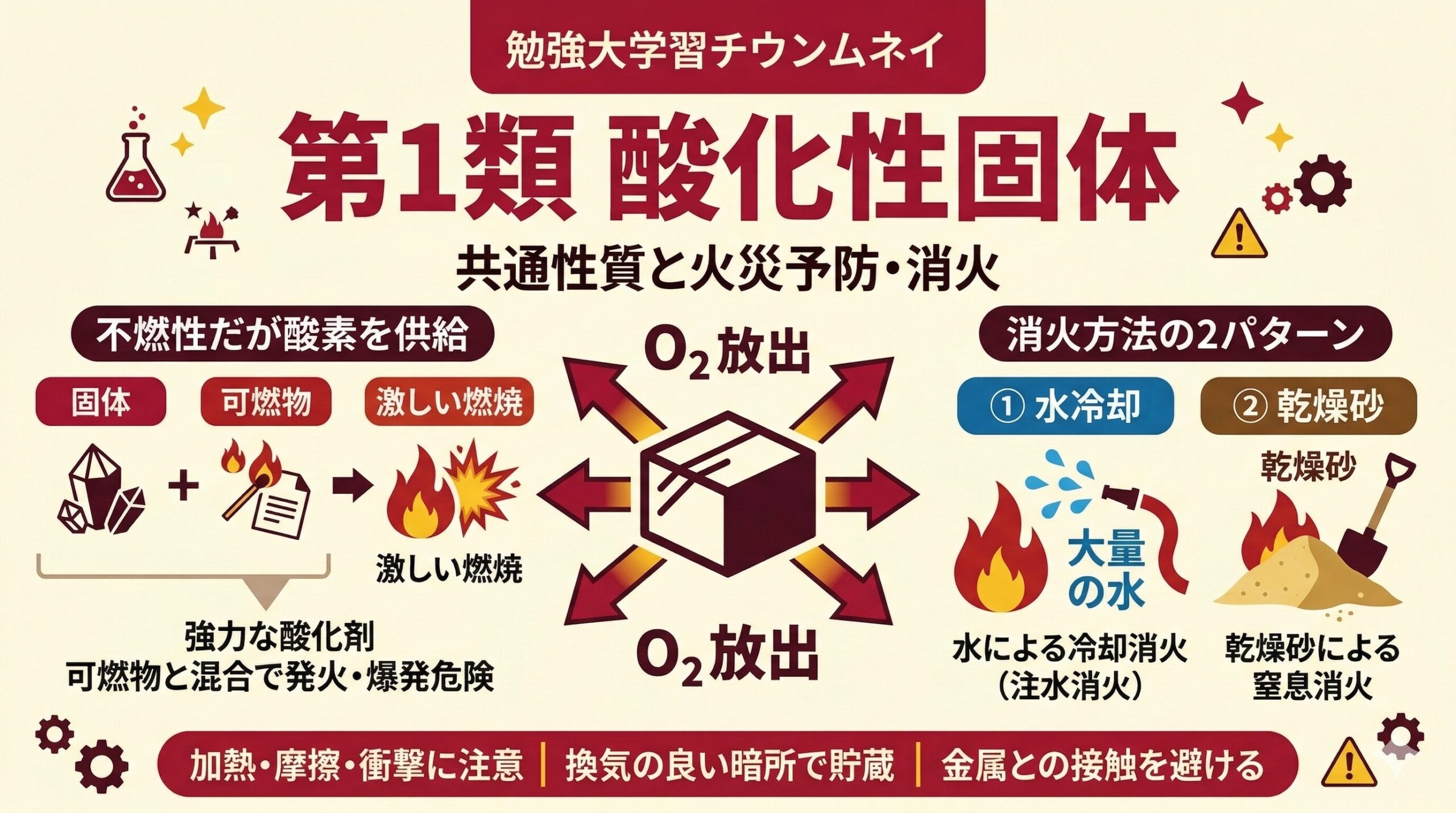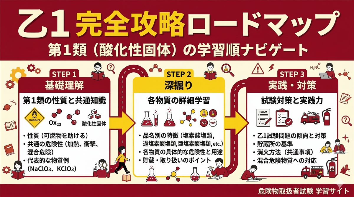 このページの使い方 このページは乙種第1類危険物取扱者(乙1)に合格するための学習ロードマップです。 第1類(酸化性固体)は「酸化性固体」に分類される危険物です。自らは燃えないが、加熱・衝撃で分解して酸素を放出し、周囲の可燃物を激しく燃やす物質です。 代表的な物質:塩素酸カリウム、過マンガン酸カリウム、硝酸アンモニウム、過酸化ナトリウムなど 科目免除で受験する方(乙4取得者) すでに乙4(または他の乙種)を持っている方は法令と物化が免除になり、性質10問だけで受験できます。試験時間はわずか35分です。 試 ...
