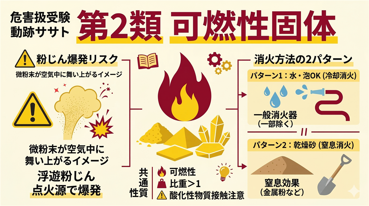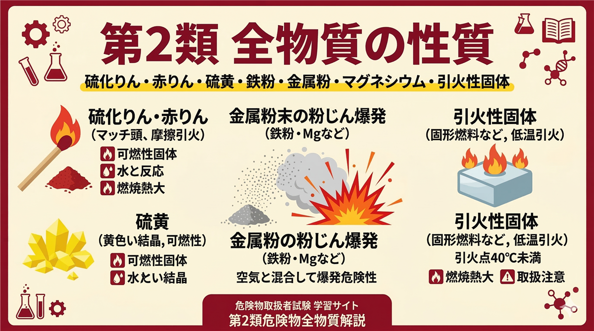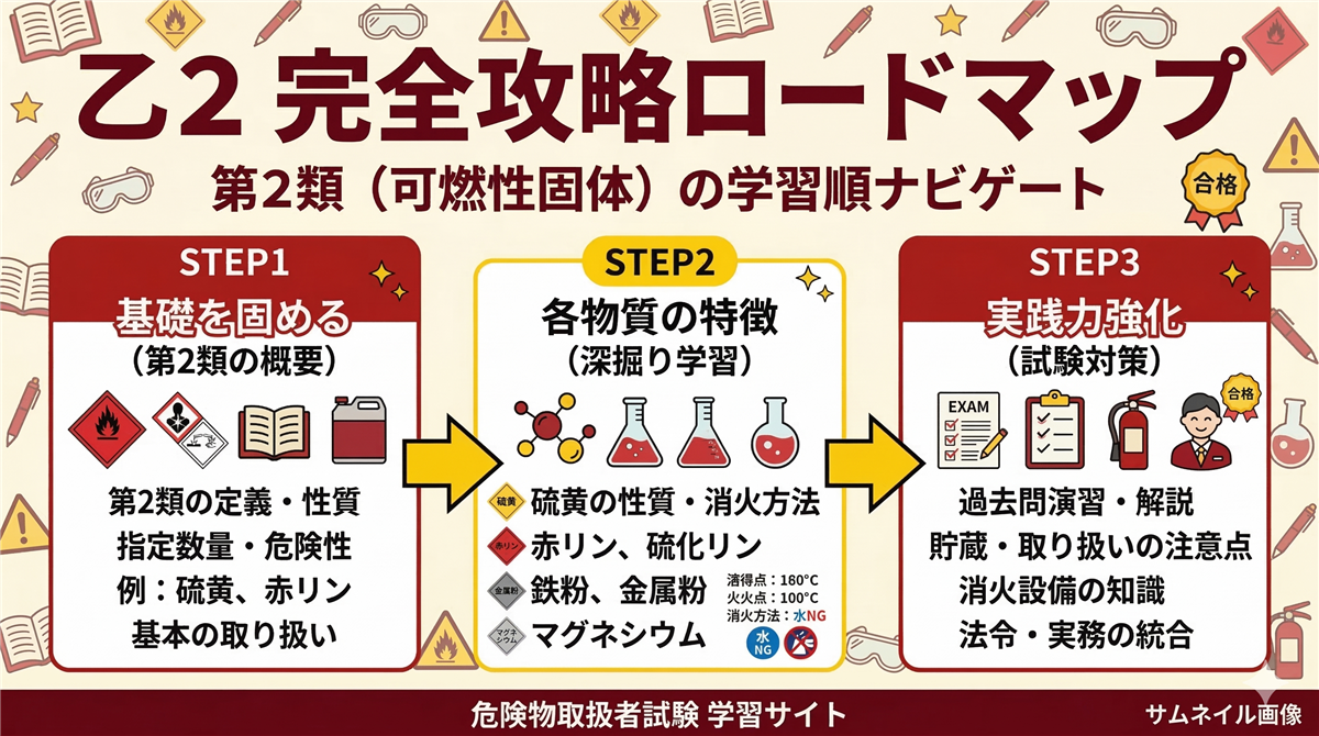 このページの使い方 このページは乙種第2類危険物取扱者(乙2)に合格するための学習ロードマップです。 第2類(可燃性固体)は「可燃性固体」に分類される危険物です。比較的低い温度で着火しやすい固体です。粉末状のものは粉じん爆発の危険があります。 代表的な物質:硫黄、赤りん、マグネシウム、鉄粉、アルミニウム粉、引火性固体など 科目免除で受験する方(乙4取得者) すでに乙4(または他の乙種)を持っている方は法令と物化が免除になり、性質10問だけで受験できます。試験時間はわずか35分です。 試験構成性質・消火(科 ...