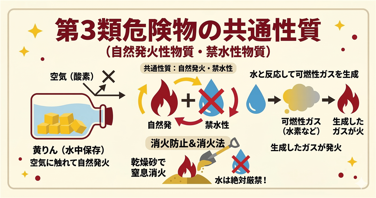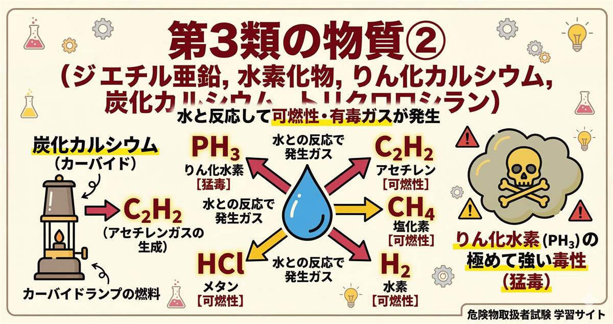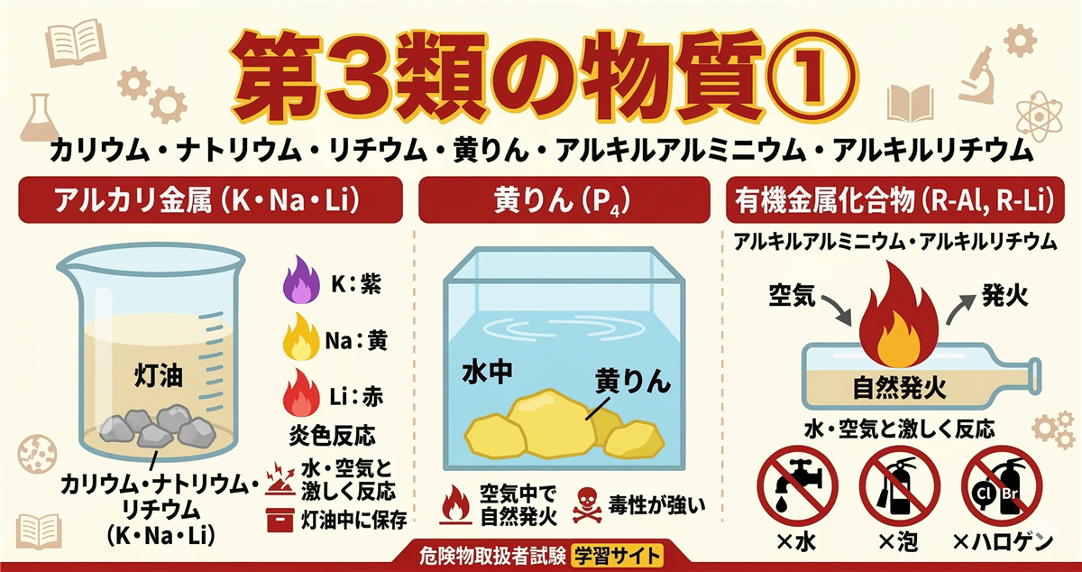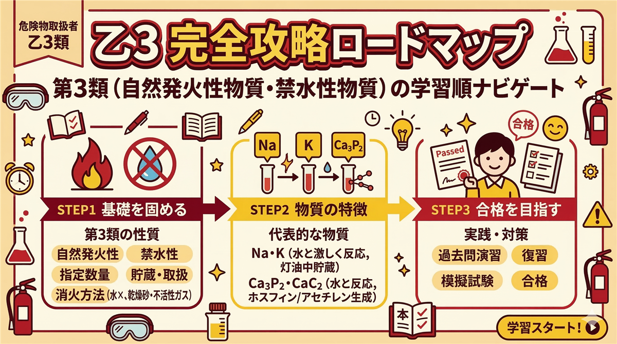 このページの使い方 このページは乙種第3類危険物取扱者(乙3)に合格するための学習ロードマップです。 第3類(自然発火性物質・禁水性物質)は「自然発火性物質・禁水性物質」に分類される危険物です。空気に触れると自然発火する物質、水と接触すると発火・可燃性ガスを発生する物質です。保護液での貯蔵が重要なテーマになります。 代表的な物質:カリウム、ナトリウム、黄りん、アルキルアルミニウム、炭化カルシウムなど 科目免除で受験する方(乙4取得者) すでに乙4(または他の乙種)を持っている方は法令と物化が免除になり、性 ...